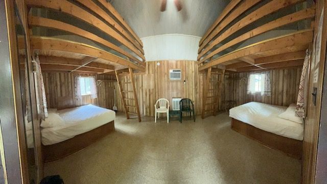 | DELUXE CABINS ( A, B, C ) Each one room deluxe cabin is equipped with electricity, heat, AC, ceiling fan and 4 double beds to sleep eight people. Picnic table, water, fire pit, and electric outlets are outside. There is no bathroom or kitchen. Linens are not supplied. No pets are allowed inside cabin. 8 person maximum occupancy. |